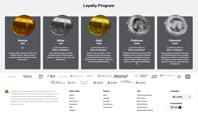 Si buscas una plataforma de casino y apuestas deportivas online de reciente lanzamiento, Appuesta ofrece un paquete completo. Con una amplia selección de juegos, opciones de pago flexibles (incluidas criptomonedas) y un programa VIP por niveles, ofrece una excelente relación calidad-precio. Su atención al cliente bilingüe y el procesamiento de retiros los fines de semana contribuyen a una experiencia centrada en el usuario.