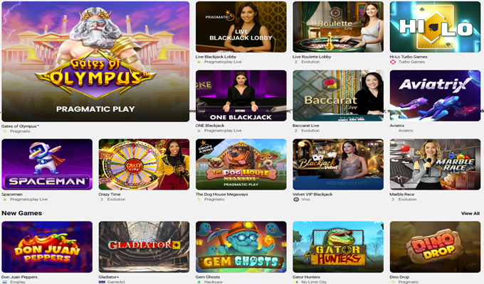 Tipos de juegos : El casino cuenta con más de 5.000 tragamonedas y más de 5.000 juegos en total, incluyendo casino en vivo, juegos de mesa, juegos de choque y una sección de apuestas deportivas.