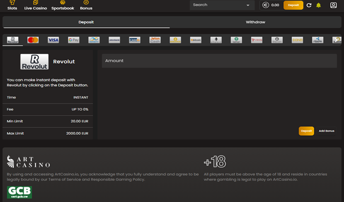 ArtCasino puede presumir de sus más de 40 métodos de depósito y retiro que cubren pagos tanto con criptomonedas como con monedas fiduciarias.