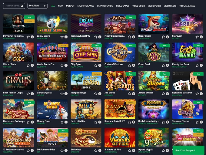 Nuestra opinión : El sistema de búsqueda y filtros es excelente; tanto si buscas tragamonedas Megaways como variantes de póker poco comunes, las encontrarás rápidamente. Hay una gran variedad de juegos para todos los gustos. Los juegos cargan muy rápido tanto en la versión de escritorio como en la móvil.