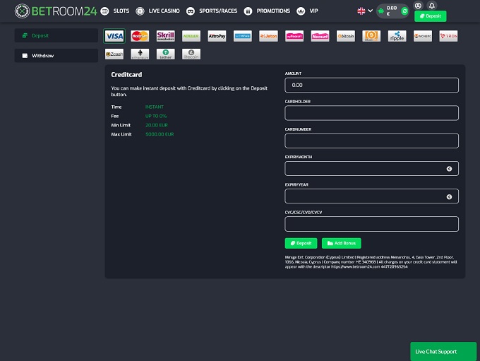 Betroom24 está totalmente preparado para las criptomonedas. Ofrece pagos tanto en moneda fiduciaria como en criptomonedas.