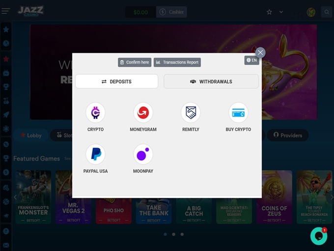 El departamento de Finanzas del Casino se encargará del proceso de verificación necesario. En caso de que el jugador no proporcione la documentación requerida dentro del plazo mencionado, la Compañía podrá denegar la solicitud de retiro hasta que se presente dicha documentación. Según los Términos y Condiciones, Jazz Casino permite un retiro semanal máximo de $5,000.Los términos y condiciones también indican que el tiempo de procesamiento para retiros de criptomonedas es de 24 horas, mientras que los retiros a través de MoneyGram, Ria y Remitly tienen un plazo de 48 horas. Además de Bitcoin, los jugadores pueden retirar fondos utilizando los siguientes métodos de pago en moneda fiduciaria: Ria, MoneyGram y Dash.