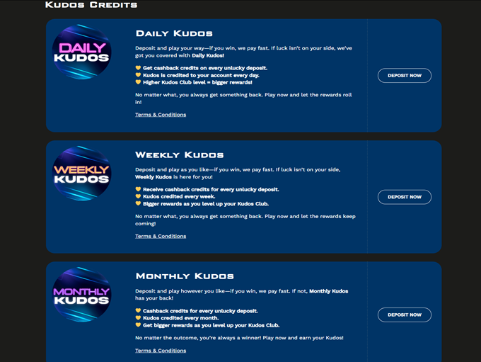 En lugar de grandes bonos por depósito inicial, Kudos Casino hace hincapié en su programa de fidelización Kudos Club :