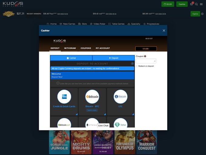 En lo que respecta a los métodos de pago, el casino Kudos acepta tanto moneda fiduciaria como criptomonedas, lo que cubre ambas categorías de pago.
