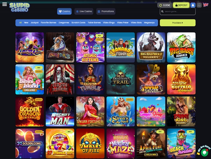 Stupid Casino cuenta con miles de títulos (más de 8.000, de docenas de proveedores como Endorphina, Evoplay, Evolution, Felt, Gaming Foxium, Fazi, Fugaso).