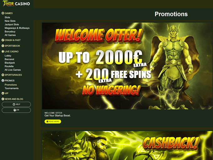 Los nuevos usuarios reciben un bono de depósito multinivel para hasta 5 depósitos. A diferencia de la estructura de 3 niveles de MondCasino, ThorCasino ofrece incentivos de bienvenida más largos, lo que podría resultar atractivo para los jugadores más fieles.